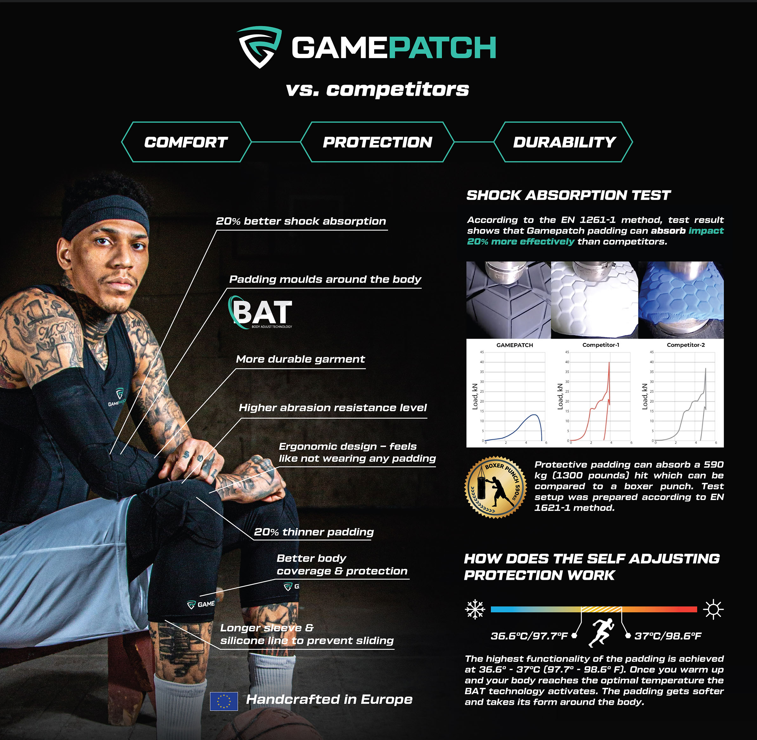 Didžiausia GAMEPATCH inovacija – BAT (Body Adapt Technology). Tai pažangi technologija, kuri leidžia apsauginiam paminkštinimui reaguoti į sportininko kūno temperatūrą.