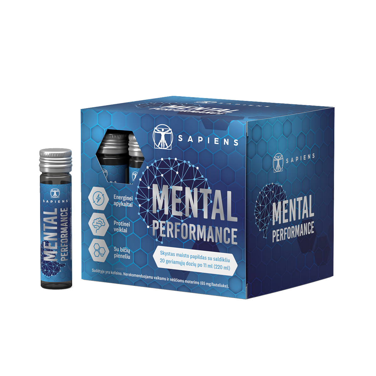 SAPIENS Mental Performance – tai skystas maisto papildas skirtas daug protiškai dirbantiems, siekiantiems išlaikyti budrumą, koncentraciją, energiją ir psichologinę pusiausvyrą.